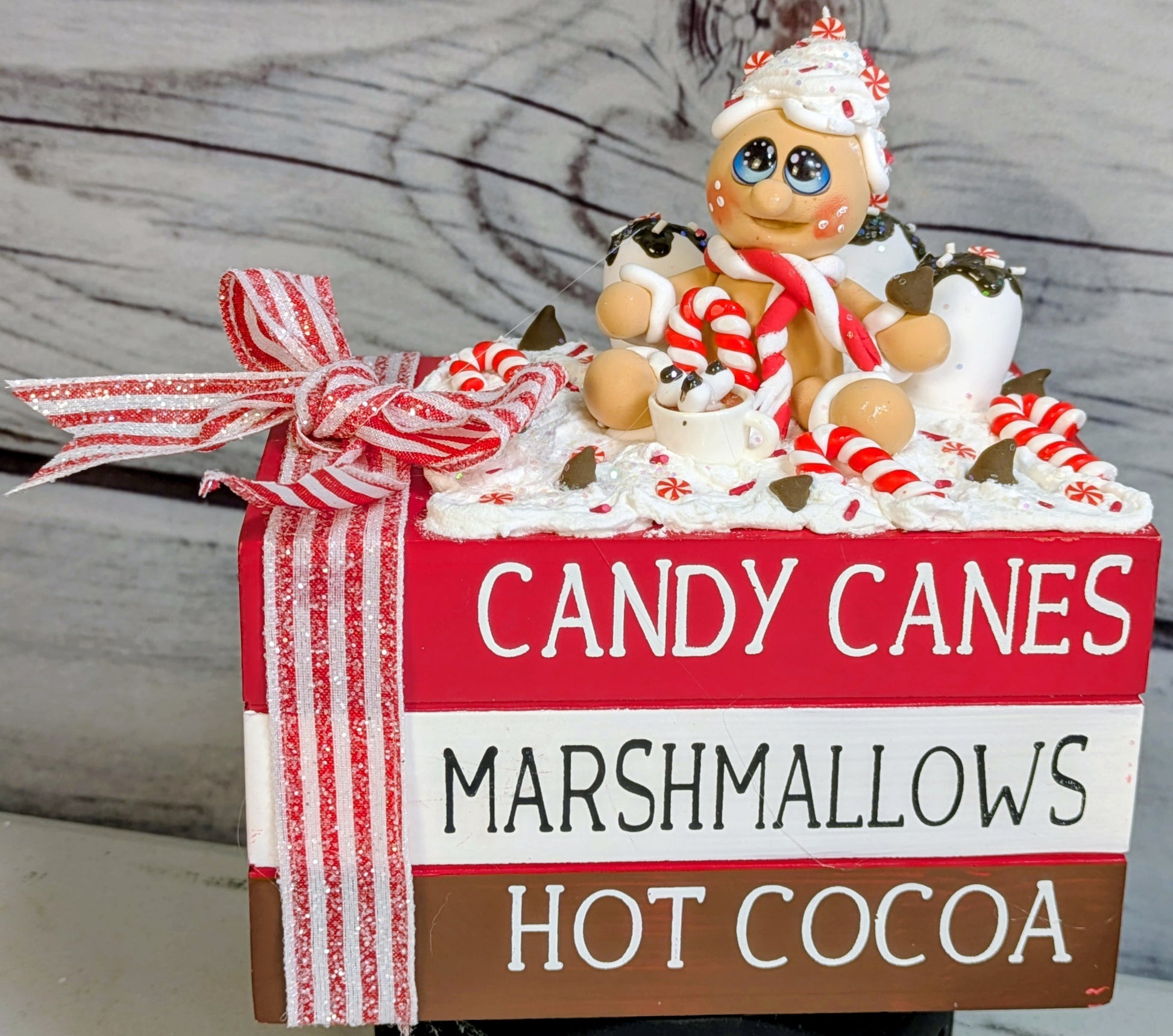 Handmade Gingerbread sitting on a book stack with marshmallows and faux little hot cocoa, with fake icing , peppermints and marshmallow and chocolate chip. Fake chocolate drizzle and with sprinkles and peppermint ribbon. Display only. Approx. 6 inches by 4 inches wide.