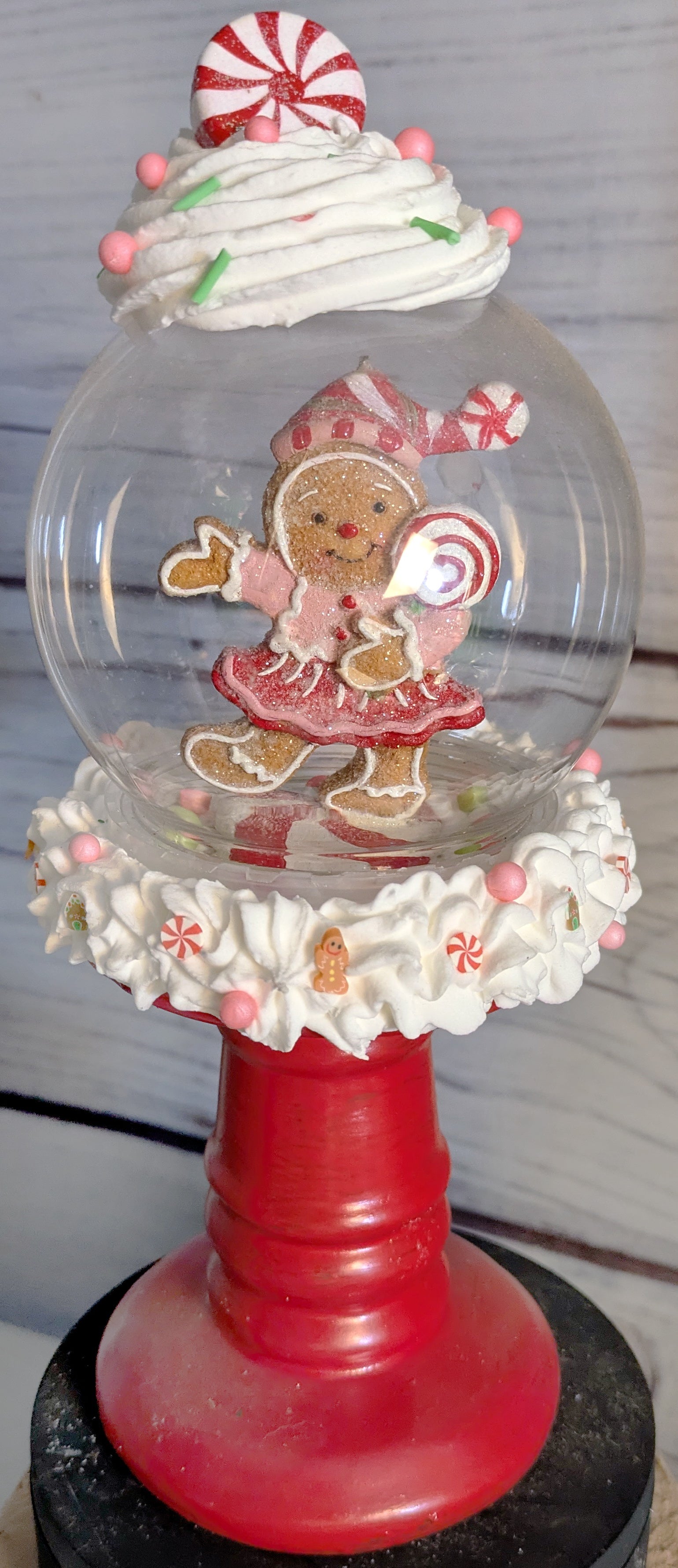Handmade Gingerbread Girl Snowglobe. Fake icing with peppermint, and gingerbread, and pink and green sprinkles Display only. Approx. 10 1/2 inches by 4 1/4inches wide.