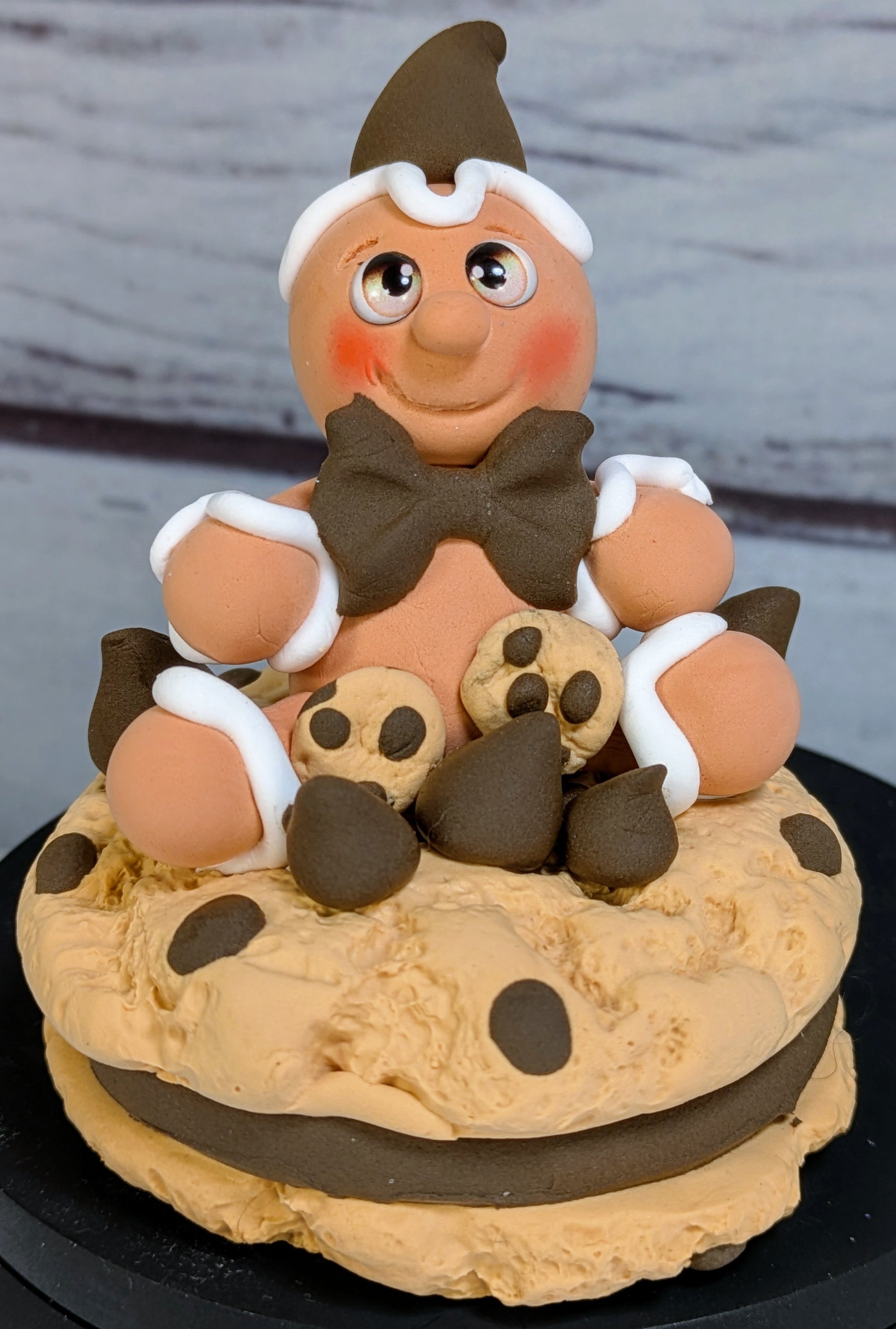 Faux (not for consumption) adorable handmade gingerbread chocolate chip cookie sandwich with chocolate chips and cookies on top. Measurements are approximately 3 inches wide by 3 3/4 inches tall.