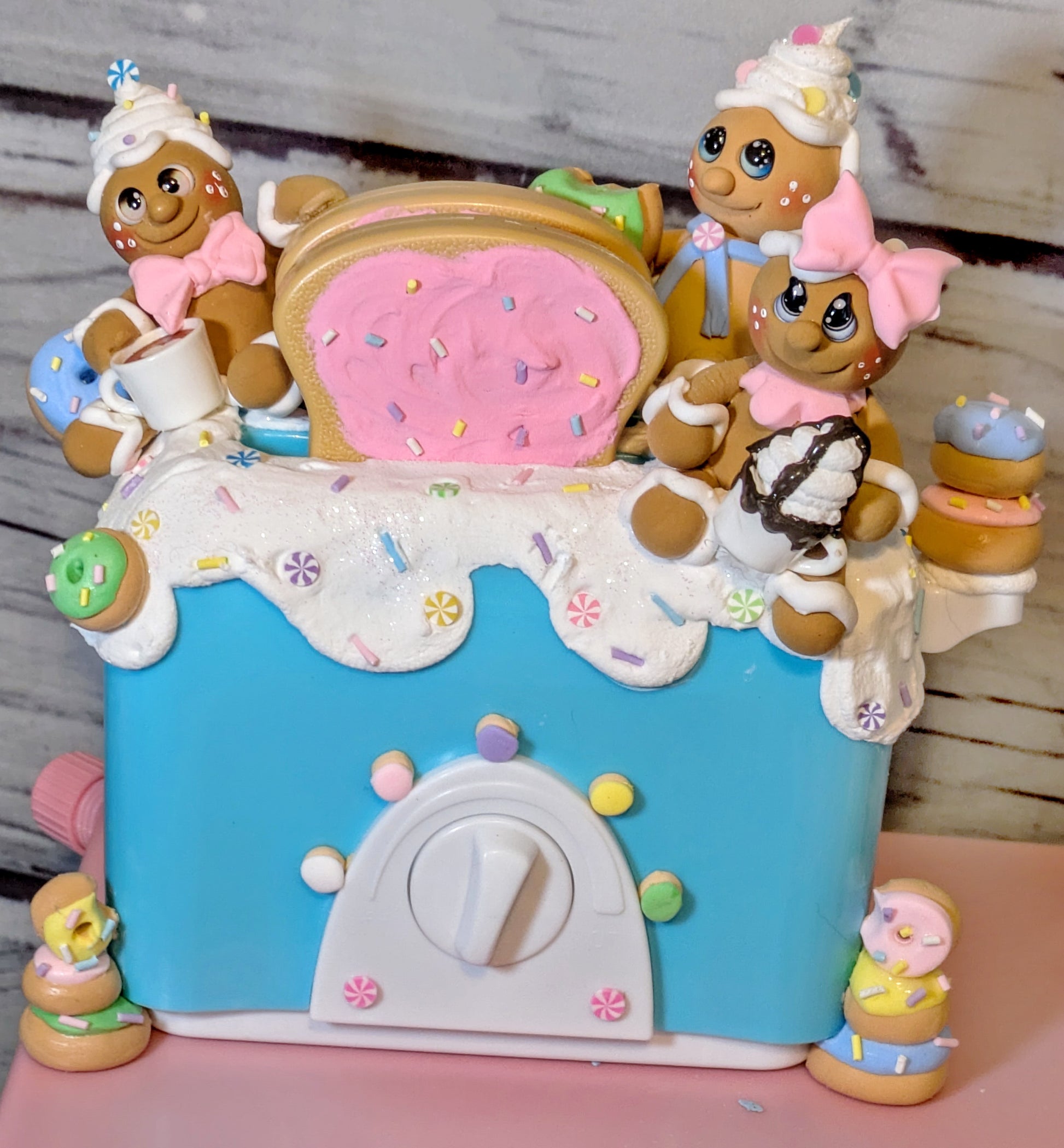 Handmade Gingerbread 3 total. Toaster with fake icing , sugar cookies, and donuts. Display only. Approx. 6 1/2 inches by 6inches wide.
